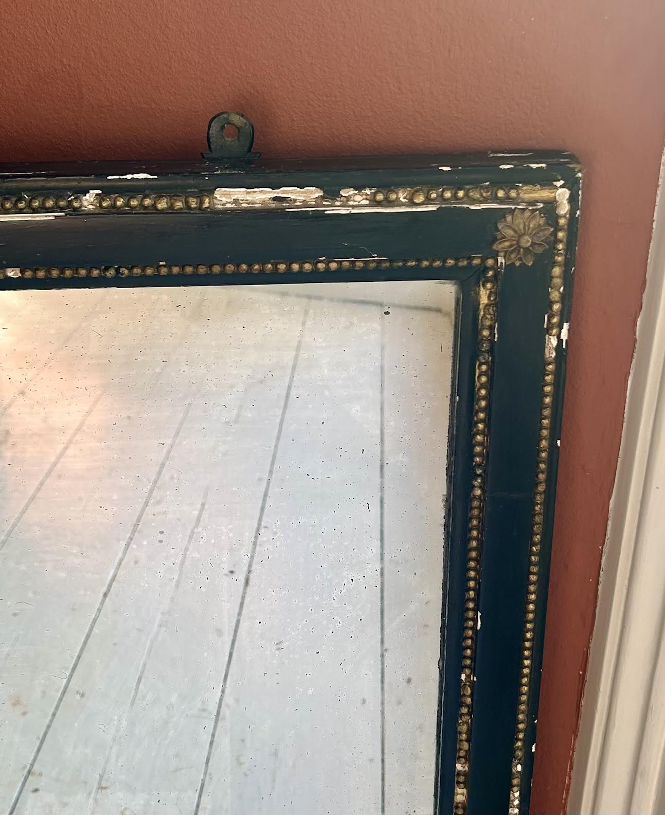 Lovely Antique Distressed Black and Gilt Over Mantle Mirror. Original glass with slight foxing. See photos.
